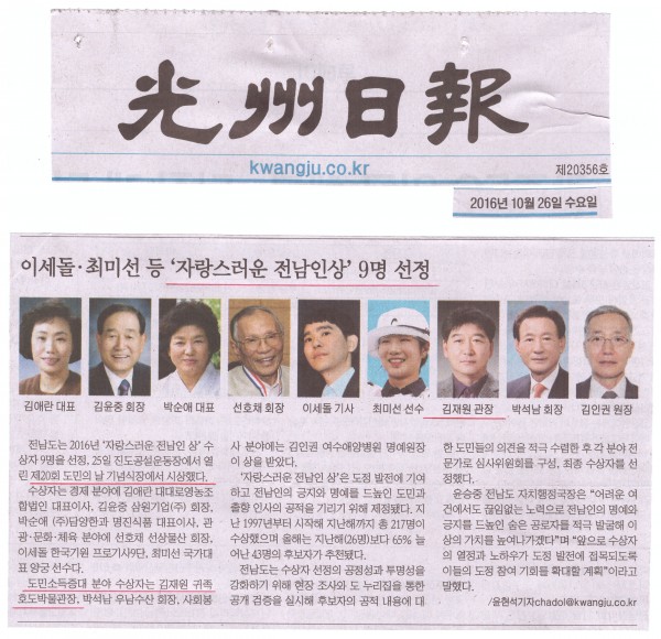 귀족호도박물관 김재원(59세) 관장이 제20회 전남 도민의 날 기념식장에서 2016년 자랑스러운 전남인 상(도민의 상)을 수상 했다.