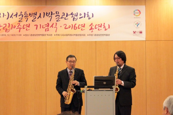 이어서 최봉락 전 KBS 교향악단 단원과 박암종 (사)서울특별시박물관협의회 회장의 기념 축하 섹소폰 연주가 있었다. 더불어 협의회에서 현재까지 진행된 다양한 전시/행사의 도록 및 포스터, 리플렛 전시까지 더해 더욱 풍성한 행사가 되었다.