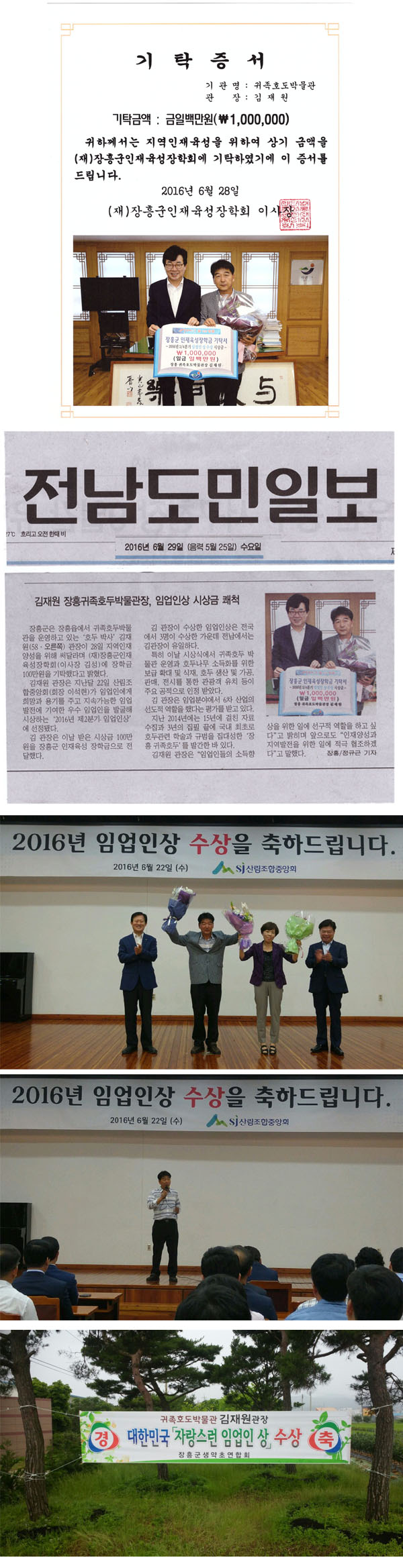 김관장은 여기서 받은 시상금 100만원을 장흥군인재육성장학기금에 기탁 했다.