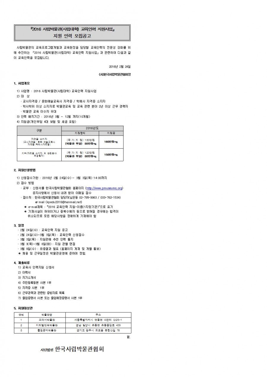 2016 사립박물관(사립대학) 교육인력 지원사업 지원인력 모집 공고
