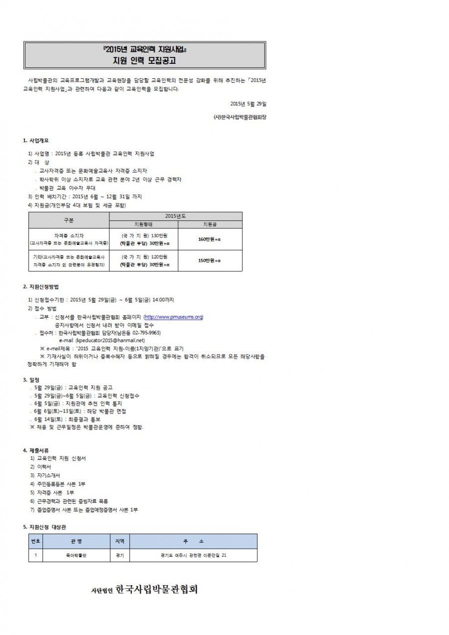 2015교육인력 지원사업 지원 인력 모집공고 (목아박물관)