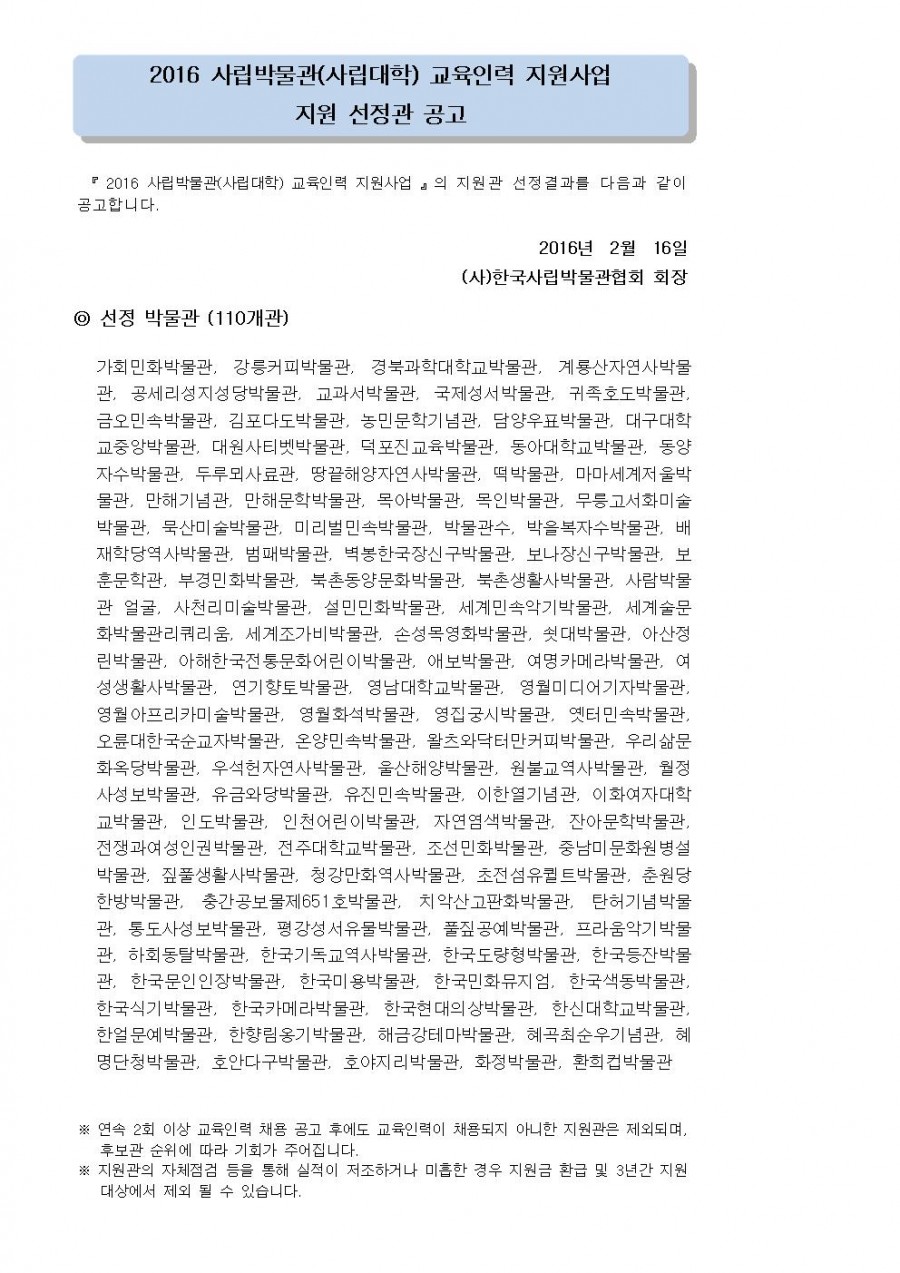 2016 사립박물관(사립대학) 교육인력 지원사업 지원 선정관 공고 페이지 정보 작성자 관리자 작성일16-02-16 19:53 조회42,276회 댓글0건 관련링크 이전글 다음글 목록 본문 댓글목록 등록된 댓글이 없습니다. 이전글 다음글 목록