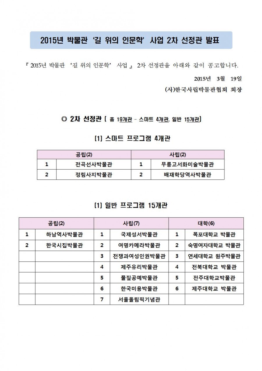 2015 박물관 '길 위의 인문학' 2차 선정관 발표 페이지 정보 작성자 관리자 작성일15-03-19 17:31 조회41,938회 댓글0건 관련링크 이전글 다음글 목록 본문 댓글목록 등록된 댓글이 없습니다. 이전글 다음글 목록