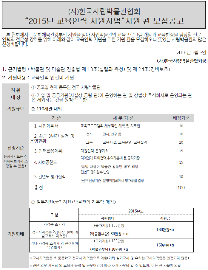 지원관 선정발표 : 2015년 1월 14일(수) / 한국사립박물관협회 홈페이지 공고