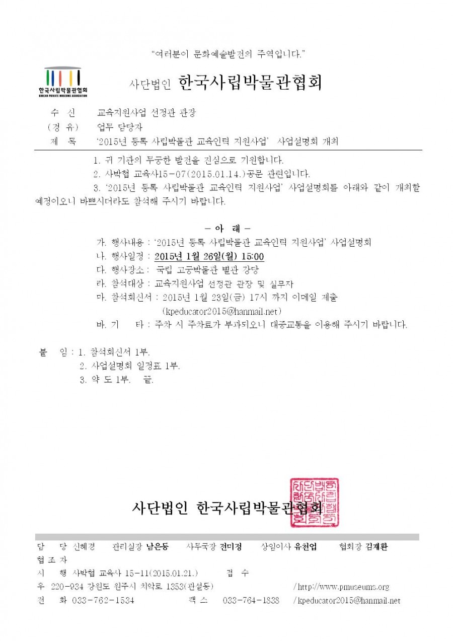 2015년 등록 사립박물관 교육인력 지원사업 사업설명회 개최안내