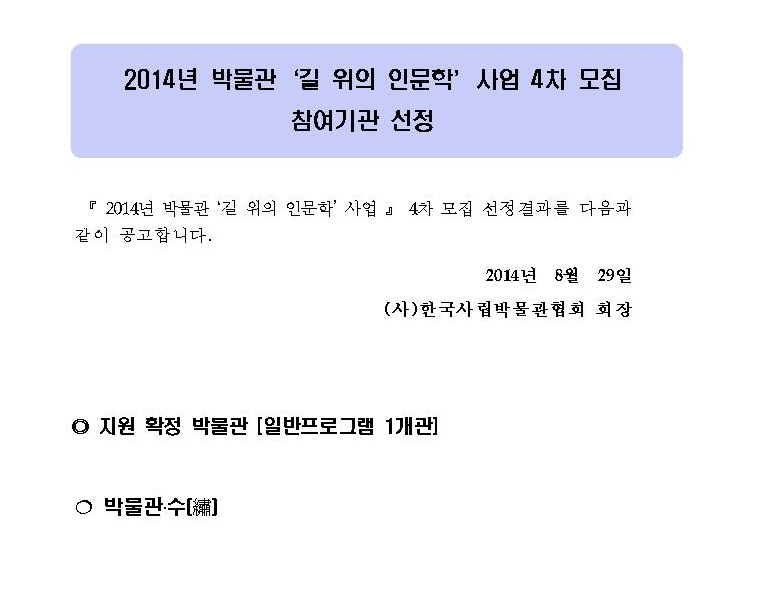 2014 박물관 길 위의 인문학 4차 기관모집 선정결과발표 페이지 정보 작성자 관리자 작성일14-08-29 14:33 조회39,631회 댓글0건 관련링크 이전글 다음글 목록 본문 댓글목록 등록된 댓글이 없습니다. 이전글 다음글 목록