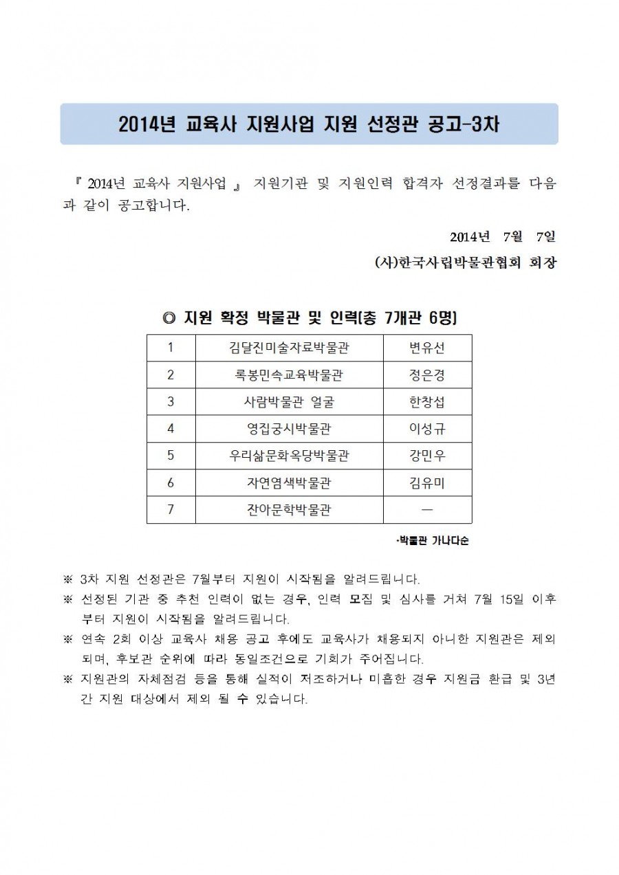 『 2014년 교육사 지원사업 』 지원기관 선정 공고 - 3차 페이지 정보 작성자 관리자 작성일14-07-07 14:29 조회39,647회 댓글0건 관련링크 이전글 다음글 목록 본문 댓글목록 등록된 댓글이 없습니다. 이전글 다음글 목록