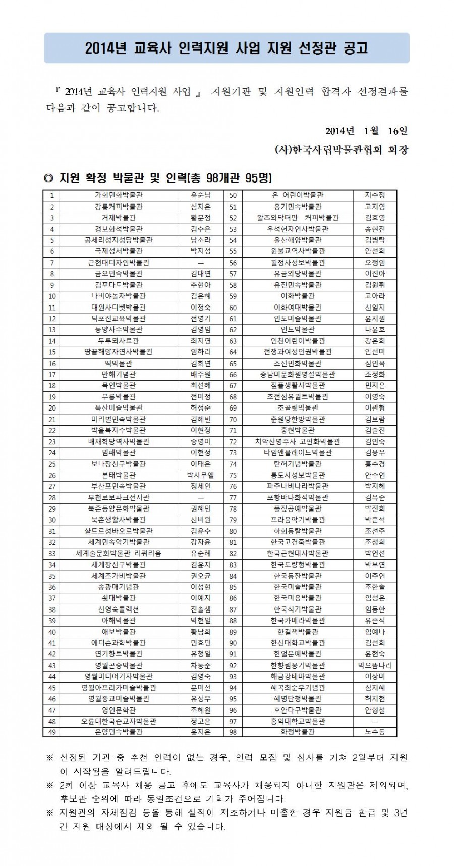 『 2014년 교육사 인력 지원사업 』 지원기관 선정 공고 페이지 정보 작성자 관리자 작성일14-01-16 14:05 조회37,287회 댓글0건 관련링크 이전글 다음글 목록 본문 댓글목록 등록된 댓글이 없습니다. 이전글 다음글 목록