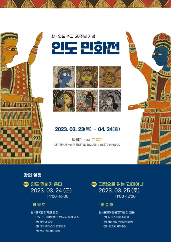 [박물관 수] 인도민화전 개최 페이지 정보 작성자 관리자 작성일23-04-13 09:22 조회14,484회 댓글0건 관련링크 이전글 다음글 목록 본문 박물관 수(관장 이경숙, 대구시 수성구 국제보상로 186길 47)에서 "한국. 인도 수교 50주년 기념 - 인도민화전"을 개최합니다.많은 관심과 참여를 부탁드립니다. 댓글목록 등록된 댓글이 없습니다. 이전글 다음글 목록